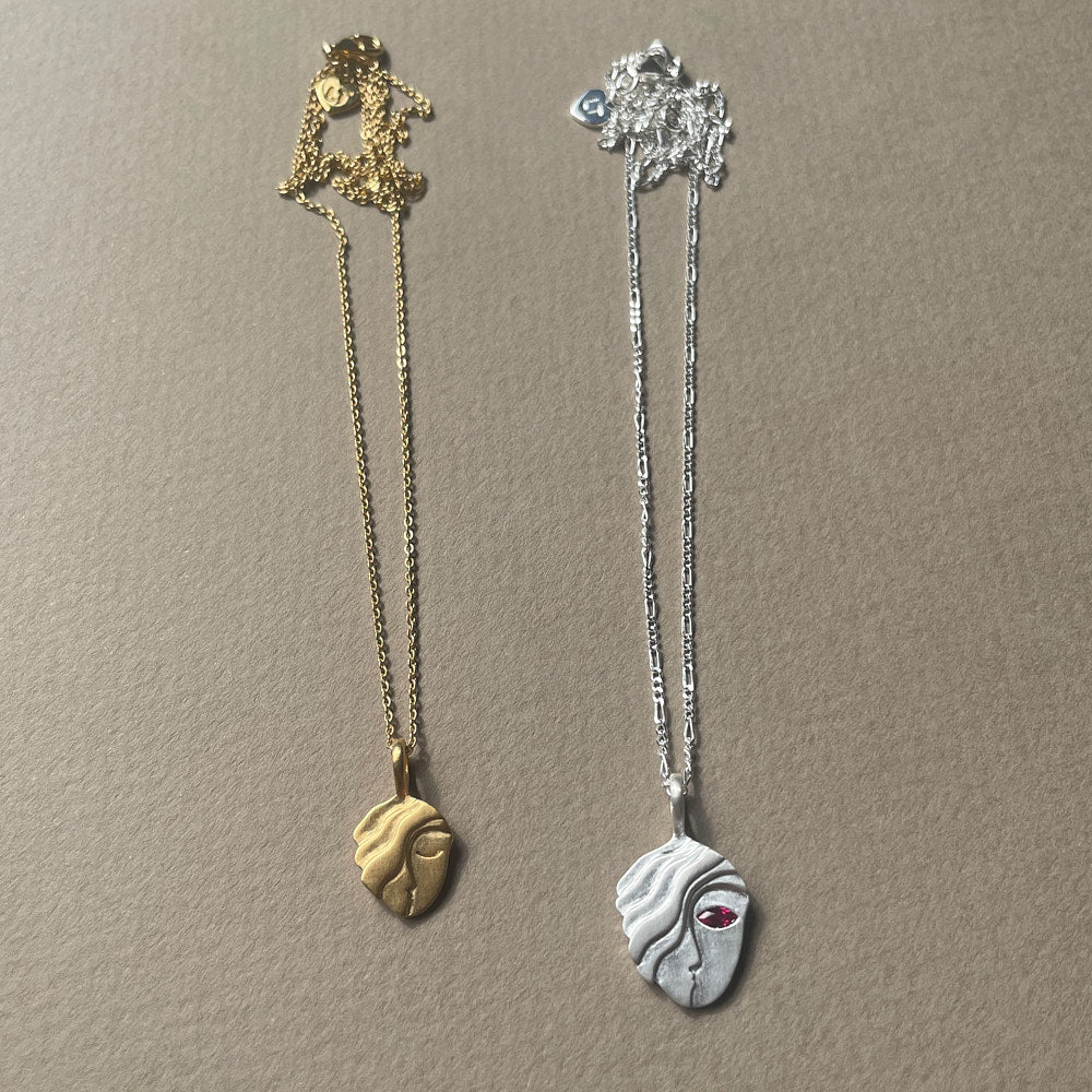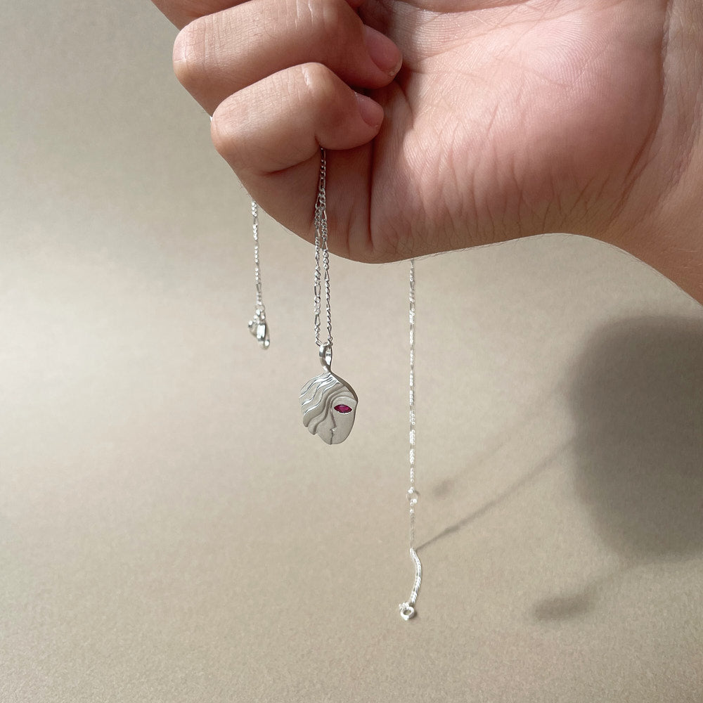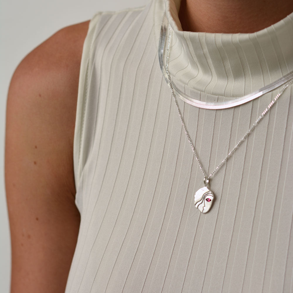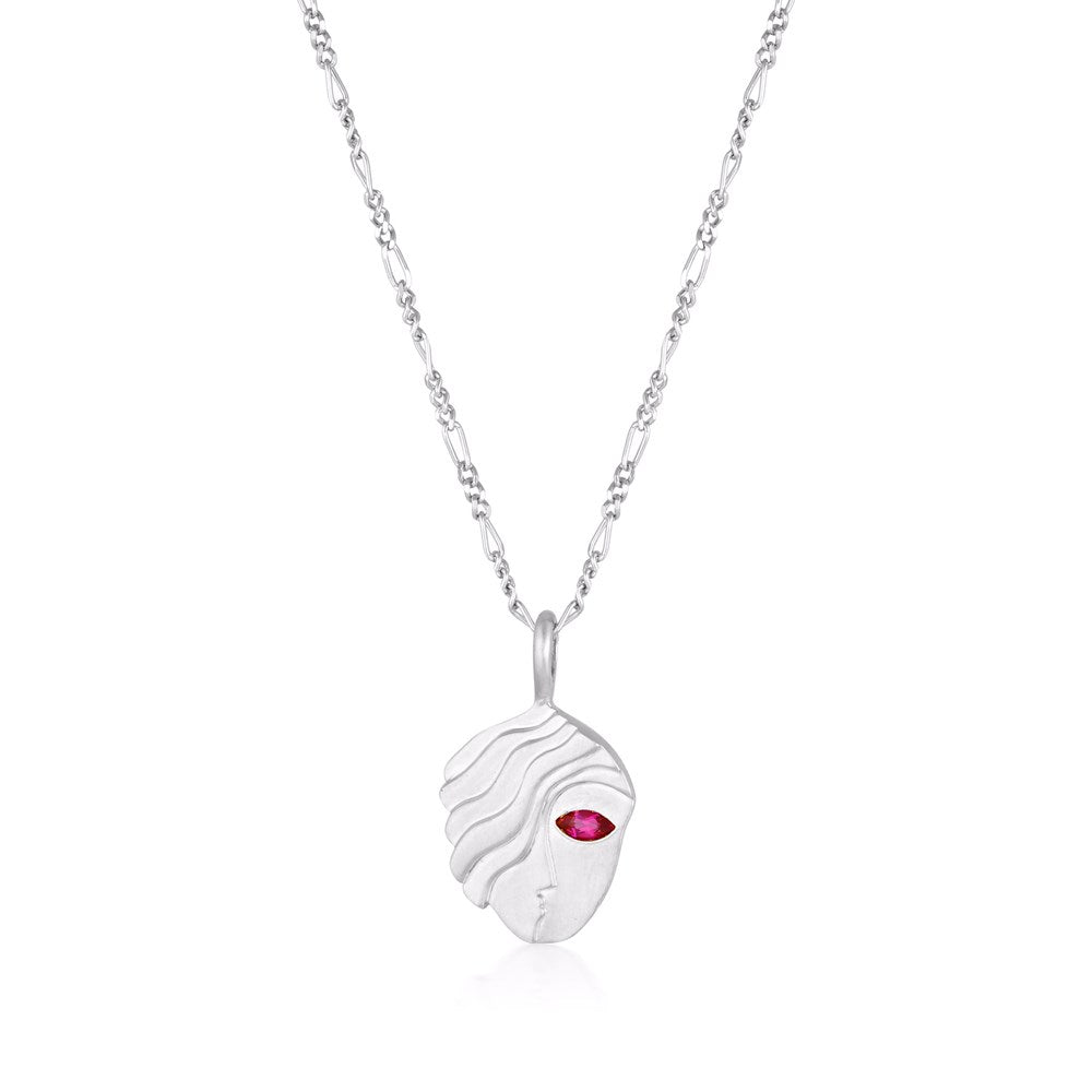 Our Aphrodite Necklace, inspired by the Greek Goddess, celebrates concepts of love and beauty. Set with a Created Ruby, this stone is symbolic of passion and love, the perfect stone to represent the goddess. Hand-finished in a silky matte texture.