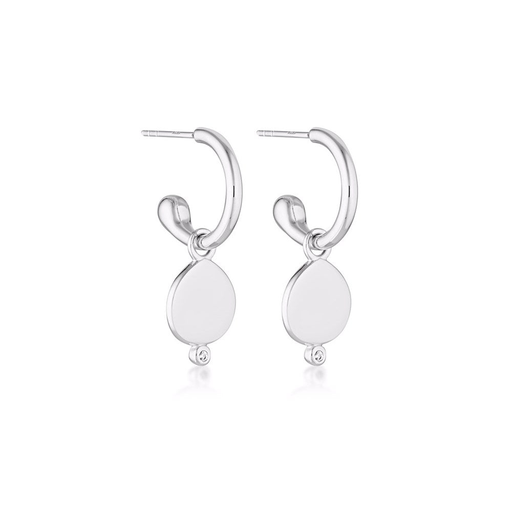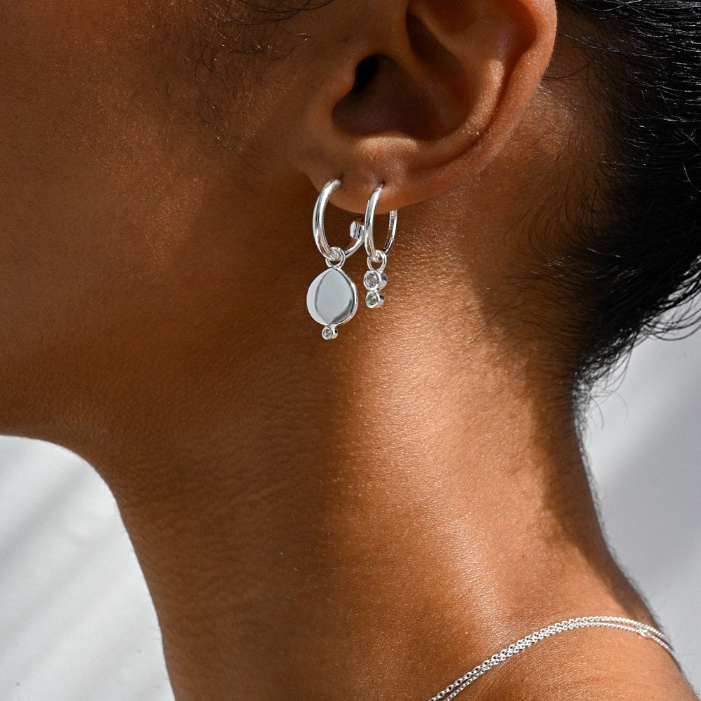 A classic pair of earrings featuring a drop shaped pendant set with a small white topaz stone. The pendant/charm is removable, so this pair of earrings can be worn with or without the feature.